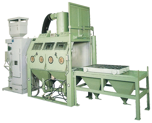 4、出料機構(gòu)后配有自動輸送線,可將噴砂加工后的工件,自動傳送到防銹液中;